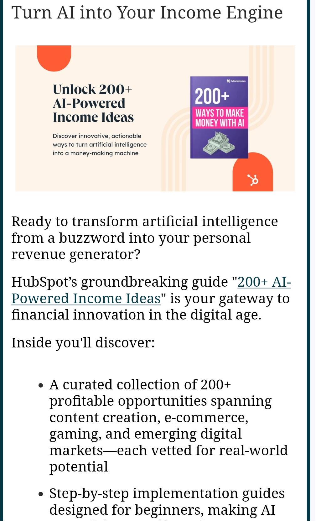 But scroll down past the weekend events and you’ll see something surprising: a prominently featured ad for HubSpot’s “200+ AI-Powered Income Ideas” guide. Yes, artificial intelligence—exactly the thing the Gazette recently warned readers about.